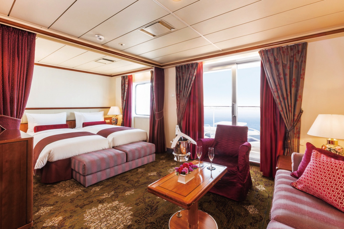 全船多達436間客房,更有露天溫泉、室外泳池、各式頂級餐廳、劇院等等,提供旅客猶如五星級飯店的海上假期。
