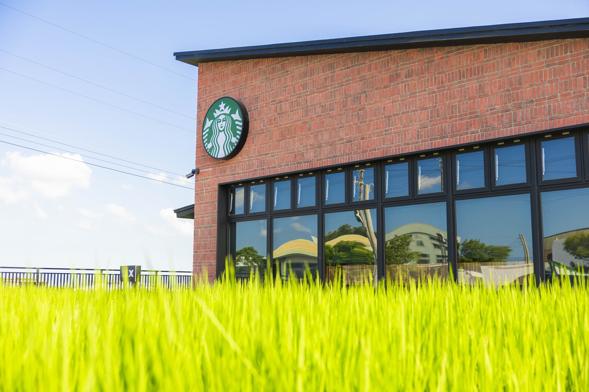 門市前方的稻田保留了原有的農作節奏,星巴克與苑裡農會攜手將品牌女神化為稻田彩繪主角,當風掠過稻浪,綠與金交織出一幅流動的畫。這不只是品牌的延伸,更是土地的對話。站在田邊,遠望星巴克Logo在陽光下閃動,彷彿咖啡香也隨稻浪一起飄揚。此刻的星巴克,不只是咖啡館,更是一處讓城市與鄉野相遇的文化地景。