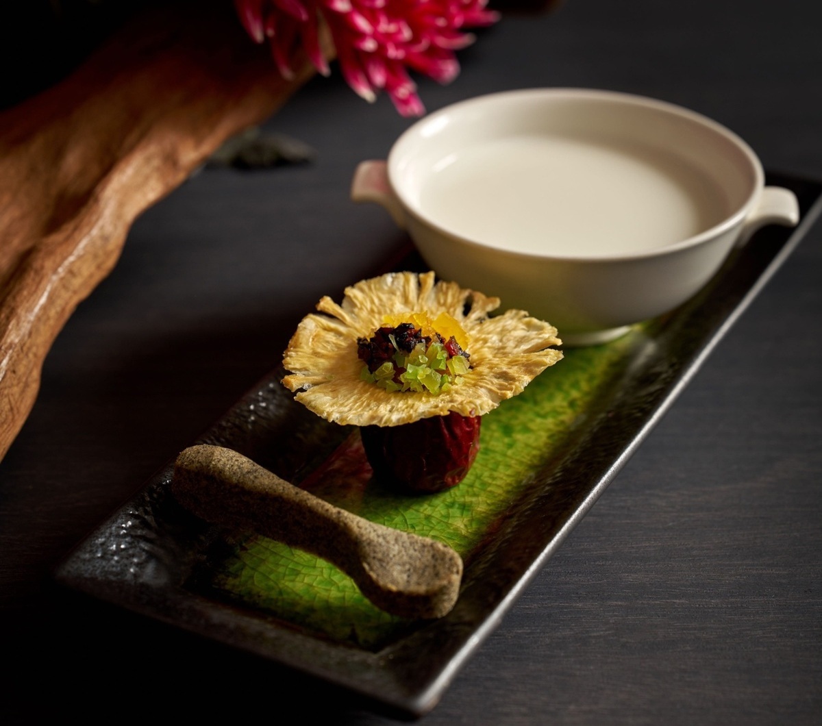 「海參竹菇」以油炸取代勾芡,帶來酥脆新意;「雪白木耳」則改良自酒家菜「炸冰塊」,外酥內凍,別具匠心。每一道料理都在味覺與視覺間,呼應皇家御宴的華麗氛圍,卻又以當代時尚語言重新詮釋。