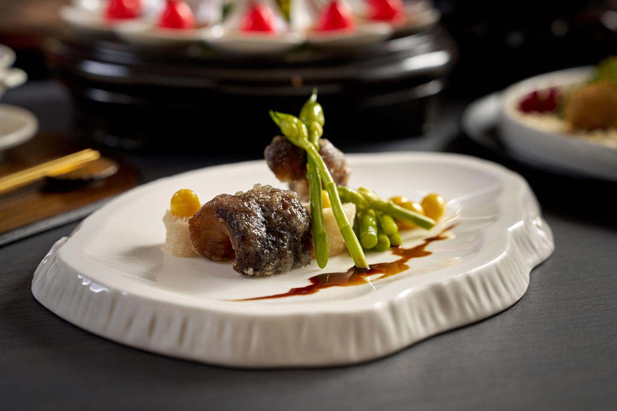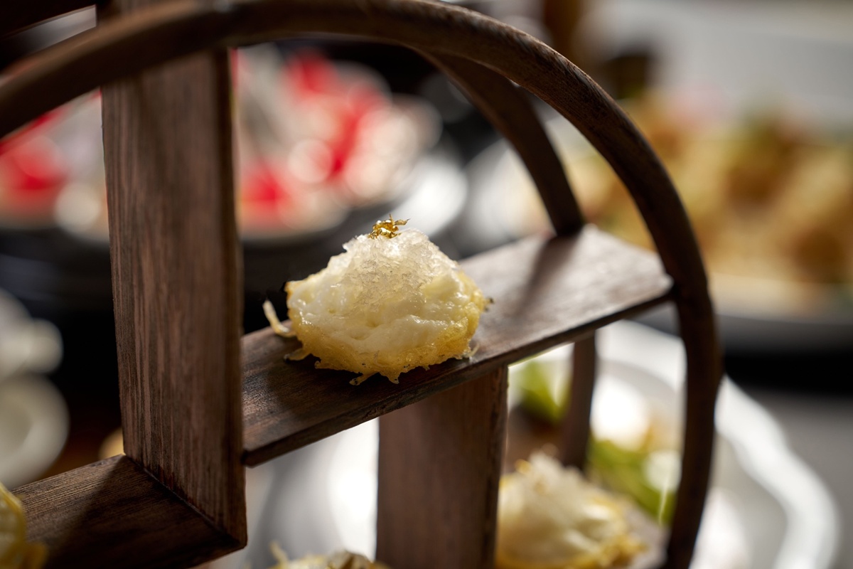 「海參竹菇」以油炸取代勾芡,帶來酥脆新意;「雪白木耳」則改良自酒家菜「炸冰塊」,外酥內凍,別具匠心。每一道料理都在味覺與視覺間,呼應皇家御宴的華麗氛圍,卻又以當代時尚語言重新詮釋。