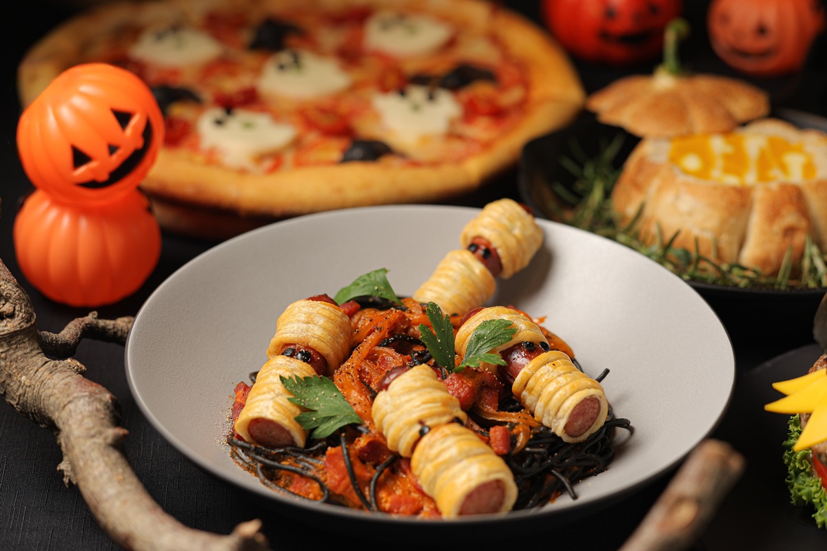 位於飯店中庭的azie餐廳將多款經典餐點注入萬聖節元素,其中主廚特別推薦「木乃伊番茄培根義大利麵」,兼具美味與趣味,期待擄獲大小朋友的味蕾。圖/台北晶華提供