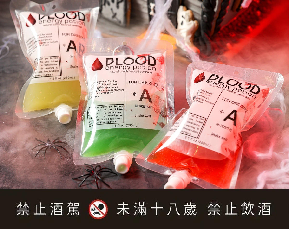 萬聖節期間,上庭酒廊推出限定調酒與多款創意無酒精飲品,包括充滿惡作劇趣味的「萬聖節血袋特調」。圖/台北晶華提供