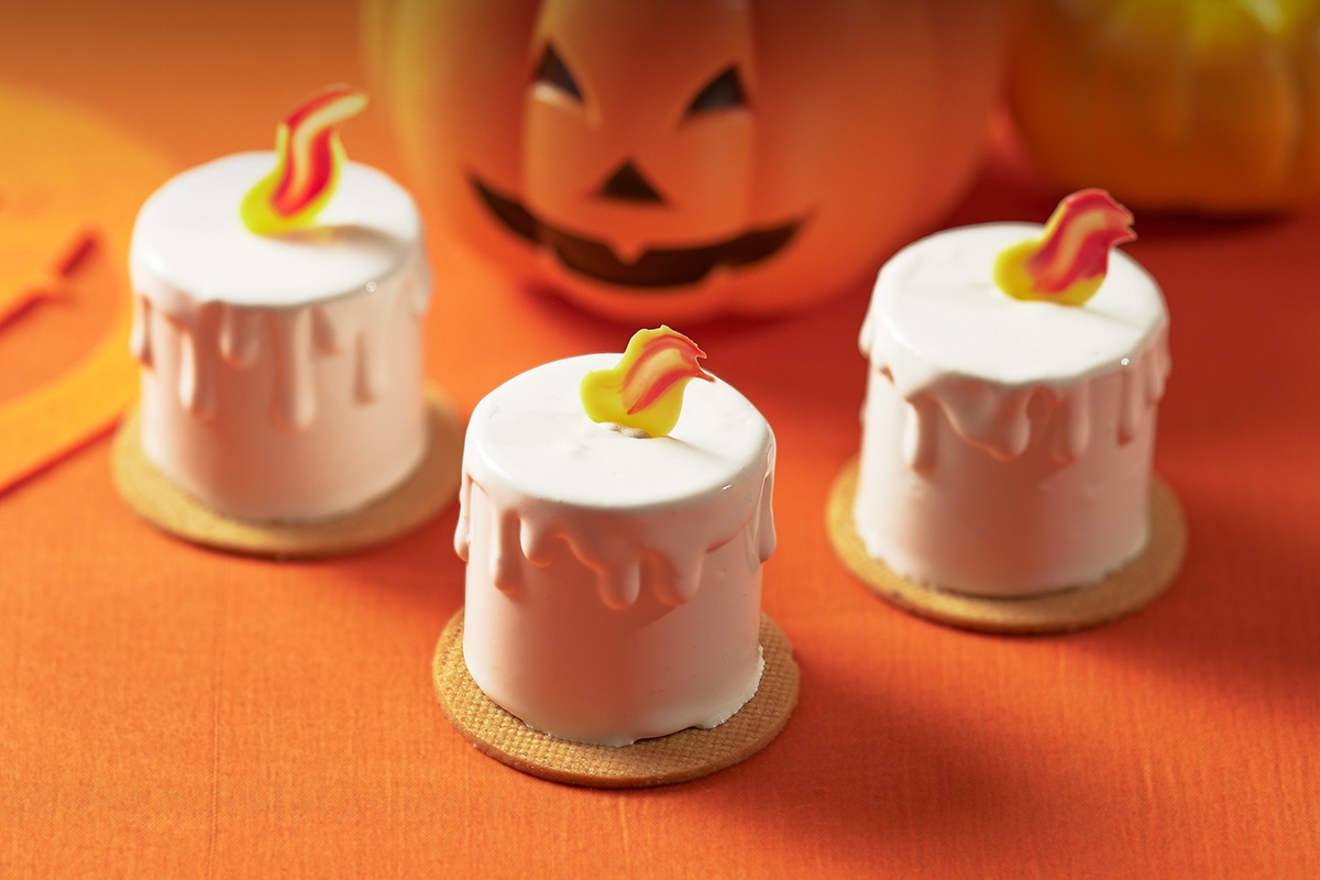 JR東日本大飯店台北萬聖節推出的「南瓜白巧克力慕斯(厄夜蠟燭)」(240元)將法芙娜白巧克力與香草杏桃凍結合,口感柔滑細膩,如夜色裡的一縷燭光。(圖/ JR東日本大飯店台北)