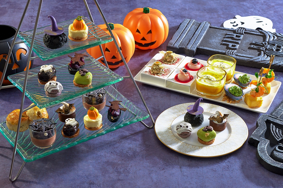 午後時光,「月台町」推出的雙人下午茶則將節慶化為藝術舞台。從菠菜魔鬼蛋、南瓜子起士球、帕馬火腿龍鳳果等鹹點,到骷髏造型的「開心果櫻桃慕斯」、小南瓜造型的「北海道檸檬起士」、木乃伊馬卡龍與幽靈慕斯,每道皆是味蕾與想像的碰撞。JR東日本大飯店以法式甜點為語言,將華麗與詭趣融入秋日香氣,為萬聖節獻上一場甜蜜惡作劇。