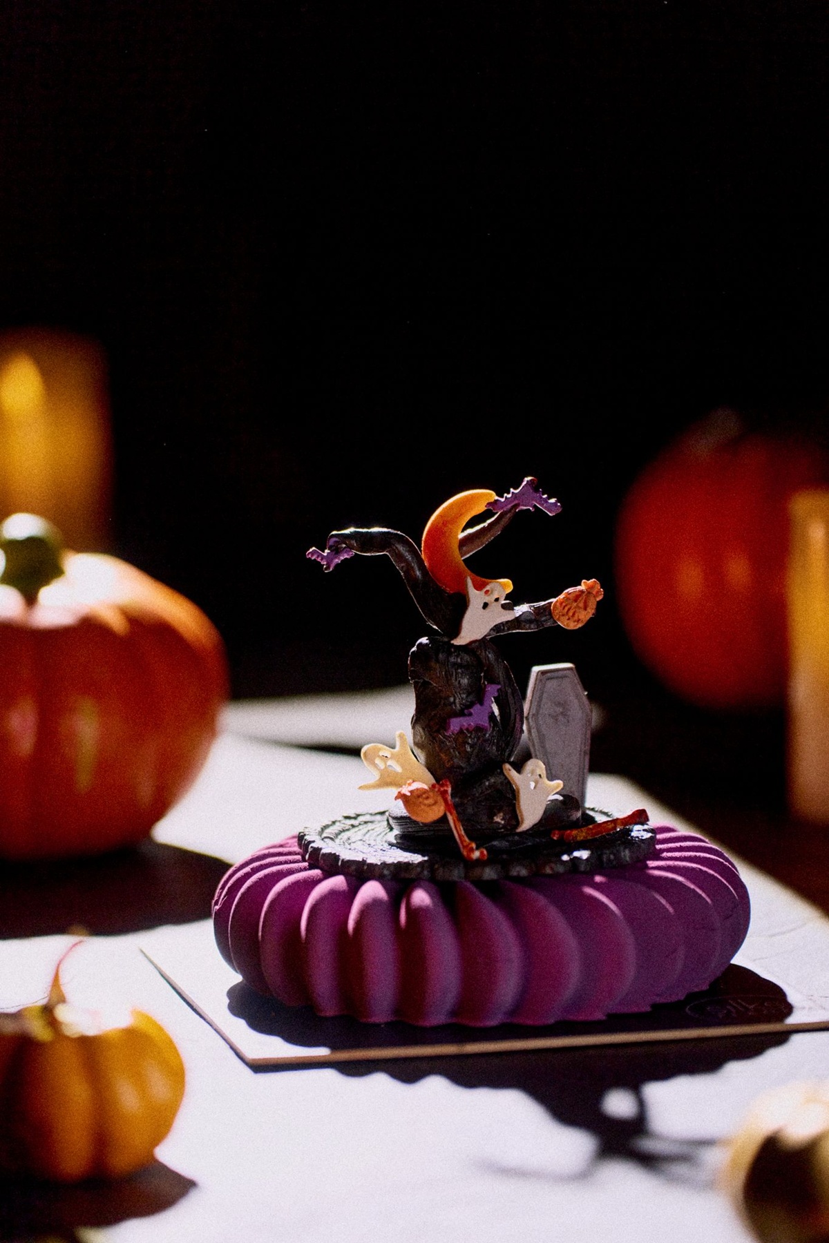 甜點主廚 Delcourt Laurent 打造「萬聖甜點屋」,內有「黯夜黑絲絨蛋糕」、「午夜南瓜榛果巧克力」、「黯黑蝙蝠抹茶慕斯」等限定甜品,每款造型宛如藝術品;還有「邪惡精靈」、「幽靈之墓」小蛋糕,以及木乃伊熱狗、鬼臉佛卡夏等造型麵包,讓節慶味更濃。
