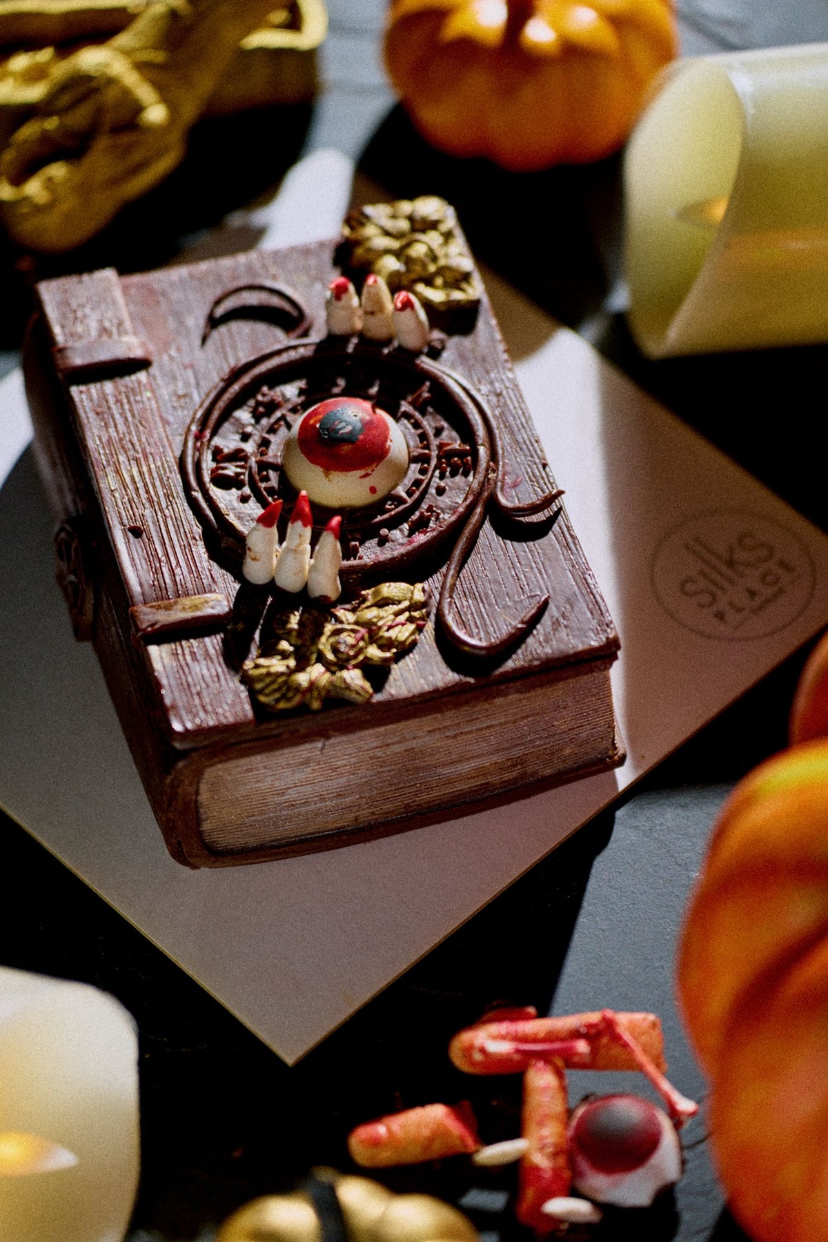 台南晶英萬聖節蛋糕「惡靈之書」是以沙哈巧克力蛋糕融合榛果及巴納脆片,六吋每顆1,280元