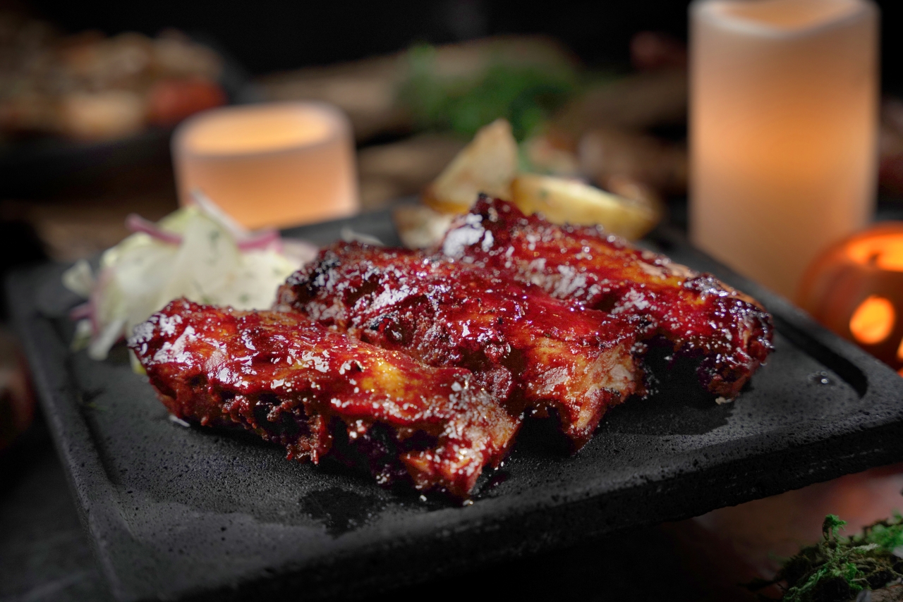 「碳烤12oz豬肋排佐珍珠洋芋」為君品酒店「女巫市集饗宴」所推出的期間限定餐點,售價1,480元+10_。_雲朗觀光提供