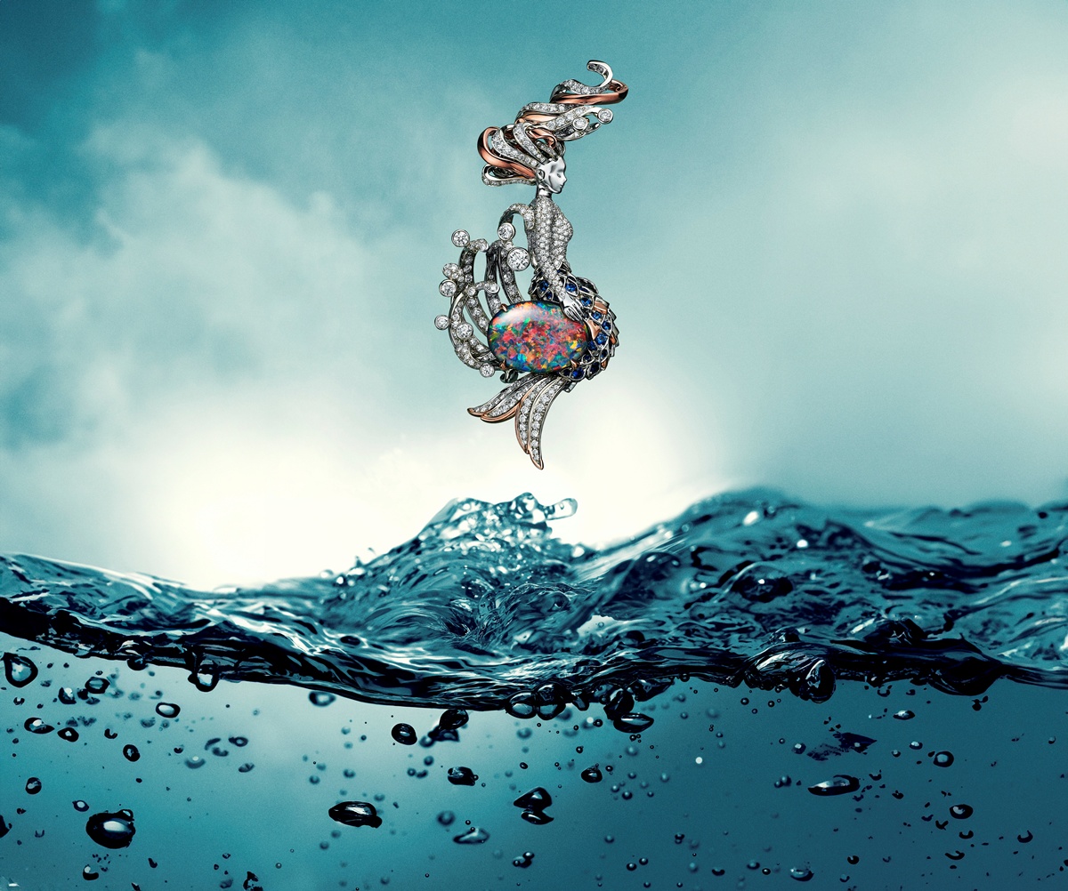 Urchin「深海星芒」透過金箔琺瑯技藝,重現海膽的虹彩質感;Mermaid「海靈仙姿」則以黑色蛋白石演繹美人魚的幻夢;Ocean Flora「碧海蔓影」推出獨一無二的鑽石珠寶腕錶。這些設計不僅是珠寶,更是流動的藝術雕塑,將 Jean Schlumberger 的傳奇語彙注入當代詩意。
