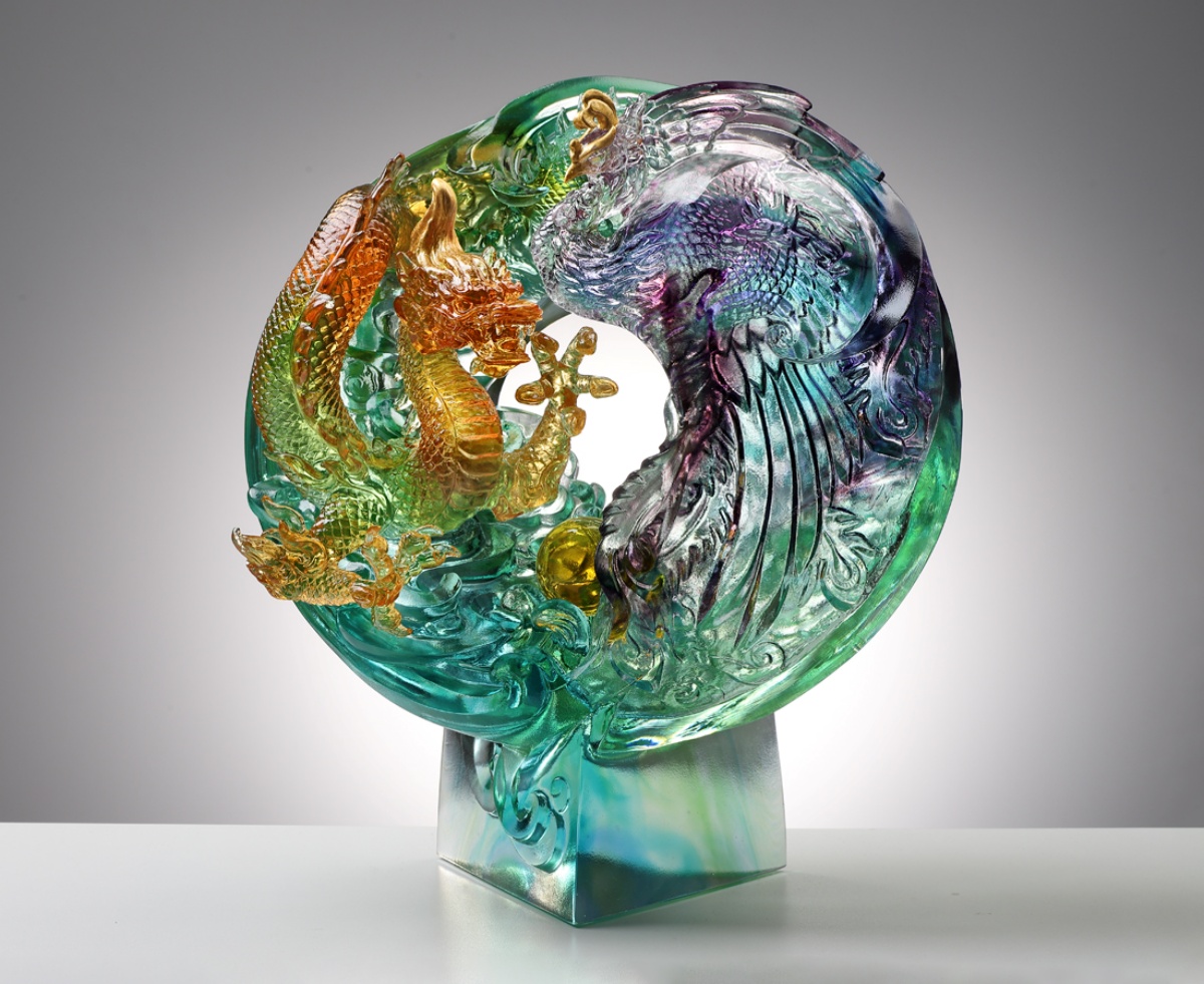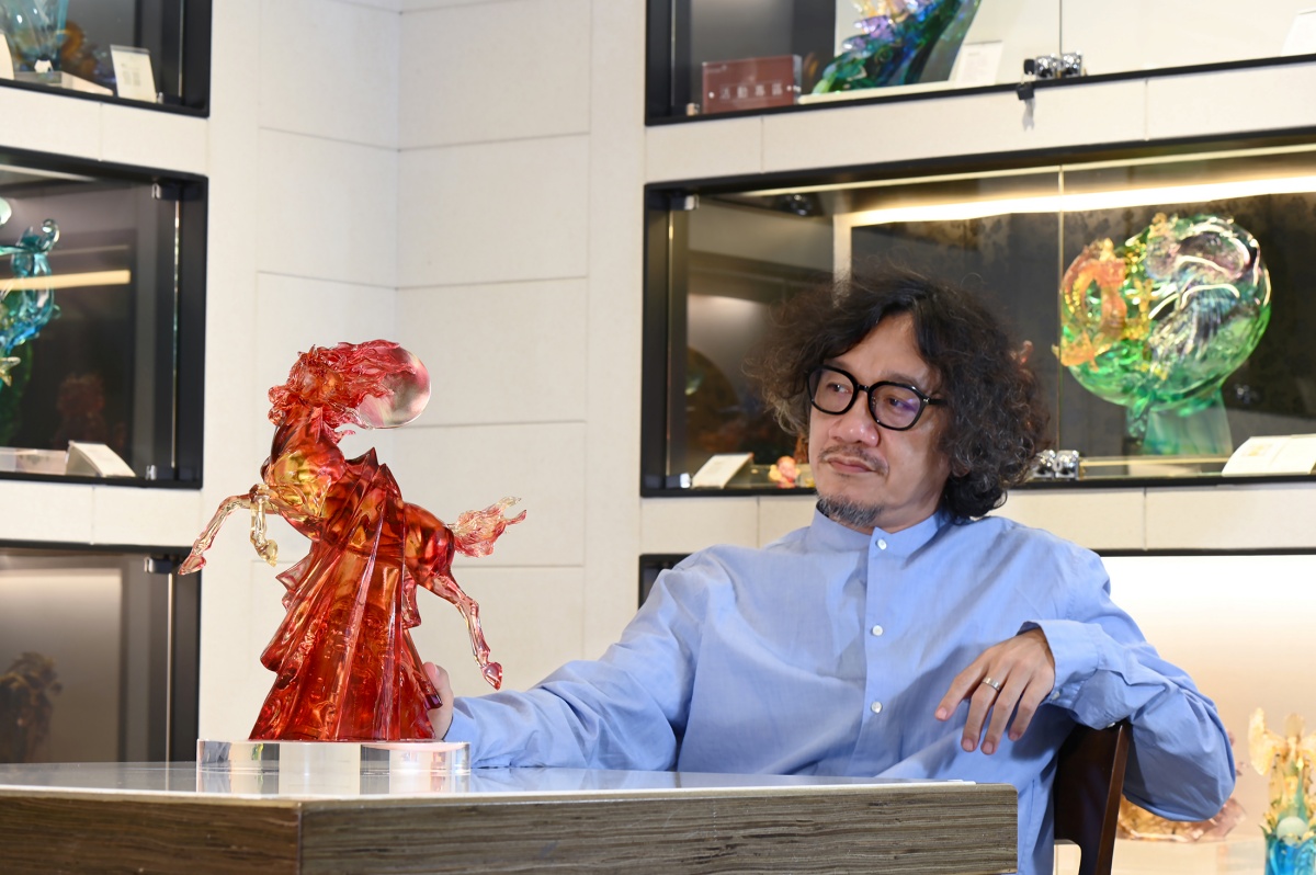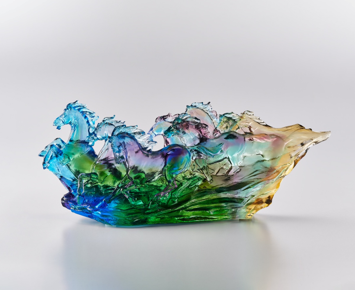 於是陳俊維將原古畫卷立體化為俯瞰的祥雲如意線條,讓畫作上安逸閑適的馬兒姿態,透過浮雕至立體、前後交錯的雕塑手法,讓八匹馬就像穿梭在畫布之中,藉由琉璃透光的特質,打造出虛實交錯的感覺,彷彿八駿從琉璃畫卷中走了出來。為了增加現代美學設計的優雅感,色彩以帶有東方感的暈染墨色,來致敬東方傳統經典畫作。並特別設計「可獨立擺放」的一匹馬,增添玩味之興,也呼應從畫布走出來了的精神,與360度欣賞之意,韻味無窮。