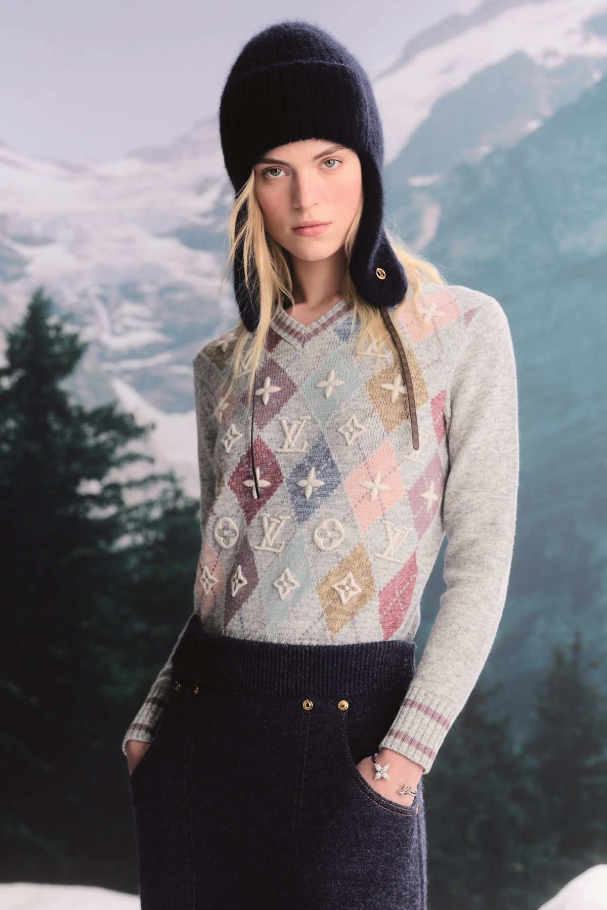 當滑雪告一段落,LV 的冬日美學仍在延續。以 北歐花紋針織衫、亮片丹寧與Monogram花卉細節 為主軸的雪後造型,讓「Après-ski」不再只是放鬆,而是一場延伸的風格體驗。
