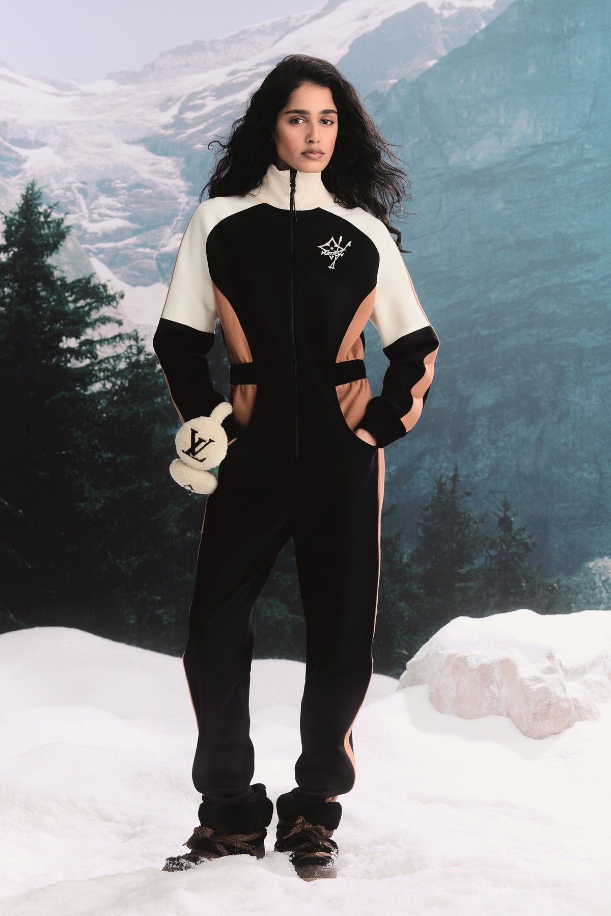 LV SKI 系列將運動機能轉化為時尚語彙。採用輕盈防水科技布料打造的滑雪外套與吊帶褲,以 回收尼龍與立體絎縫 展現品牌對永續與美感的堅持。靈感來自經典行李箱內襯的 Malletage 菱格紋 被轉化為視覺焦點,兼具線條感與保暖性能。