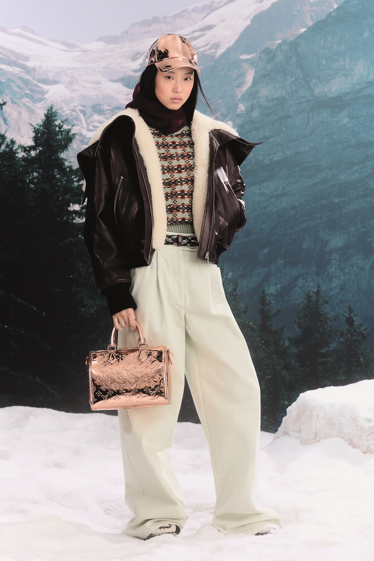 皮件系列則是整個系列的靈魂:Monogram Miroir 鏡面帆布 重新演繹經典 Alma 與 Speedy,以銀色與古銅色調捕捉冰川反光;Capucines Cozygram 羊毛皮手袋 則以巧克力與奶油色溫暖呈現冬季質感,融合功能性與收藏價值。