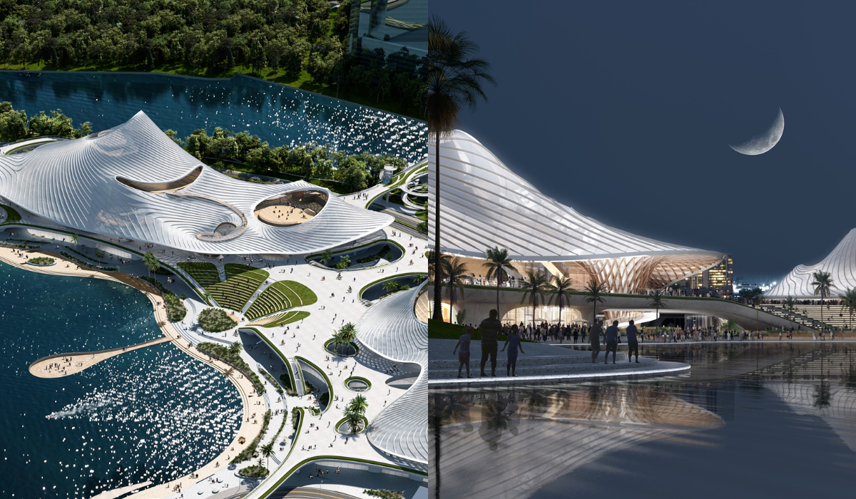在設計案中可見到綿延起伏的建築軸線,宛如從水中奔騰而出的曲面,自然流經場地蔓延至城市;兩層樓的景觀平台充滿戲劇張力地向外延伸,將中心湖、濱河公園和城市空間有機連結起來,實現自然與建築的和諧平衡。設計的核心在透過打造一條連貫的湖面視覺軸,重新建構一個超然的精神場域。