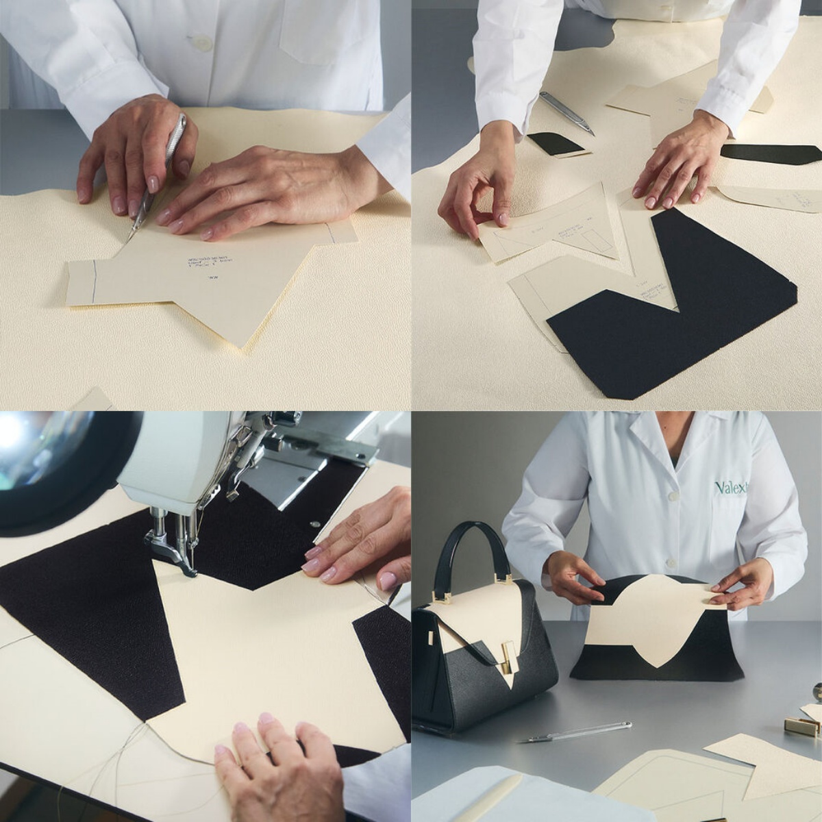Intarsia 系列採用Valextra經典 Millepunte 小牛皮革,由工匠精準切割獨立圖形,再以細緻縫合工序將其拼接而成。黑與白的對比不僅延續 Valextra 一貫的建築感語彙,更彰顯品牌對於比例、線條與結構的苛求。每一道接縫、每一處細節,皆是米蘭工藝精神的縮影