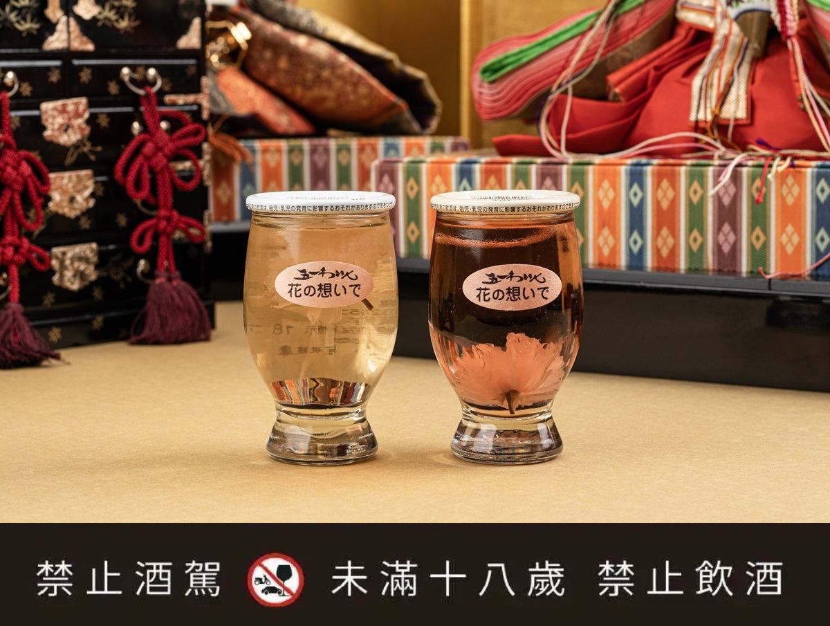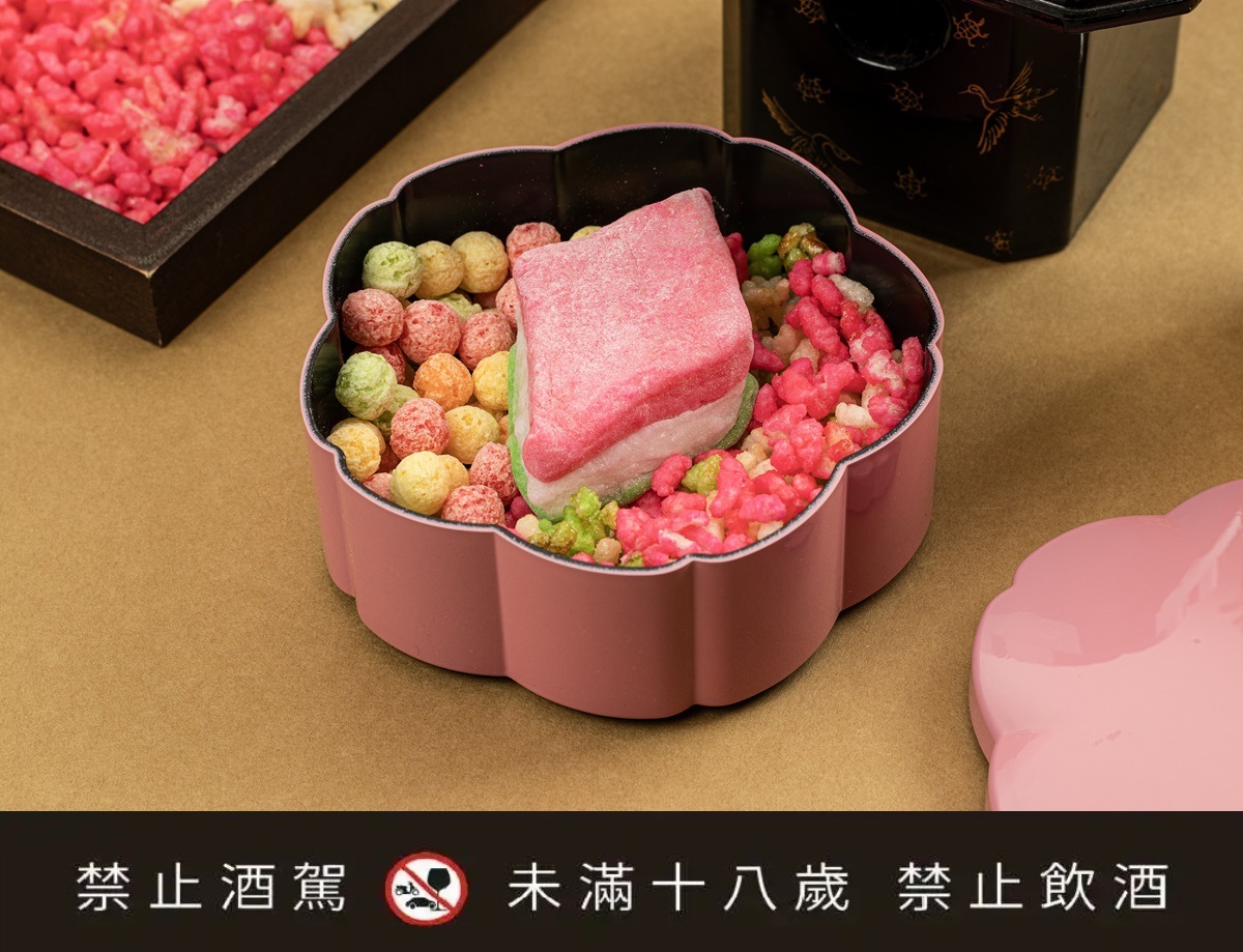 禮盒附贈櫻花葡萄酒1組2瓶,可愛的杯酒,帶有濃郁的櫻花與果香氣息,酒內整朵可食用櫻花飛舞著,讓人少女心大噴發。精緻的雙層日式漆器盒盛滿了繽紛的櫻花感,讓「女兒節散壽司禮盒」成為這個春天最奢華、最具儀式感的伴手禮。