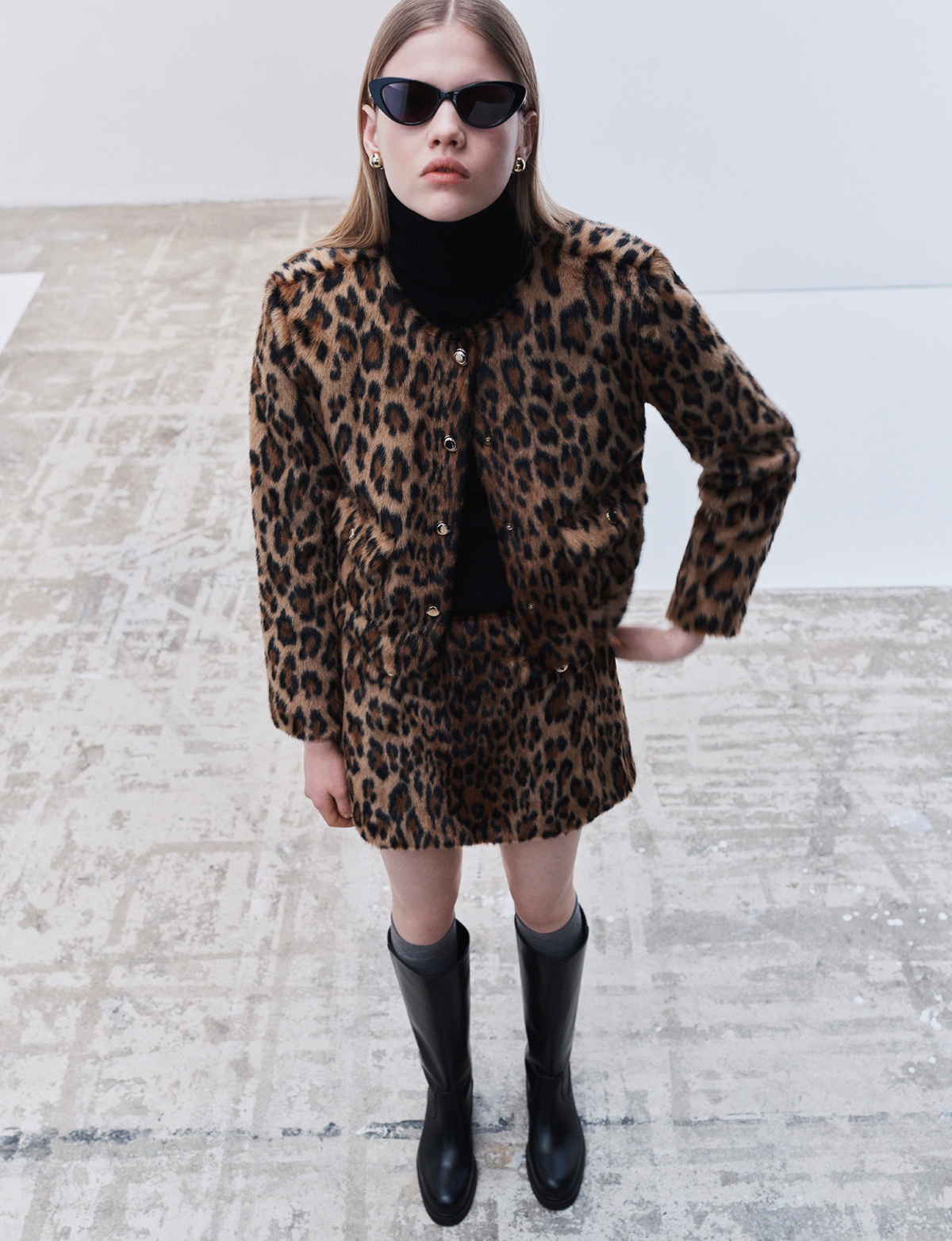 經典短版墊肩外套以仿豹紋毛絨材質大膽演繹,長版大衣則化身披肩剪裁,巧妙融合摩登與優雅。輪廓俐落,線條精準掌控;印花設計標誌鮮明,展現自信、現代的都會風貌。